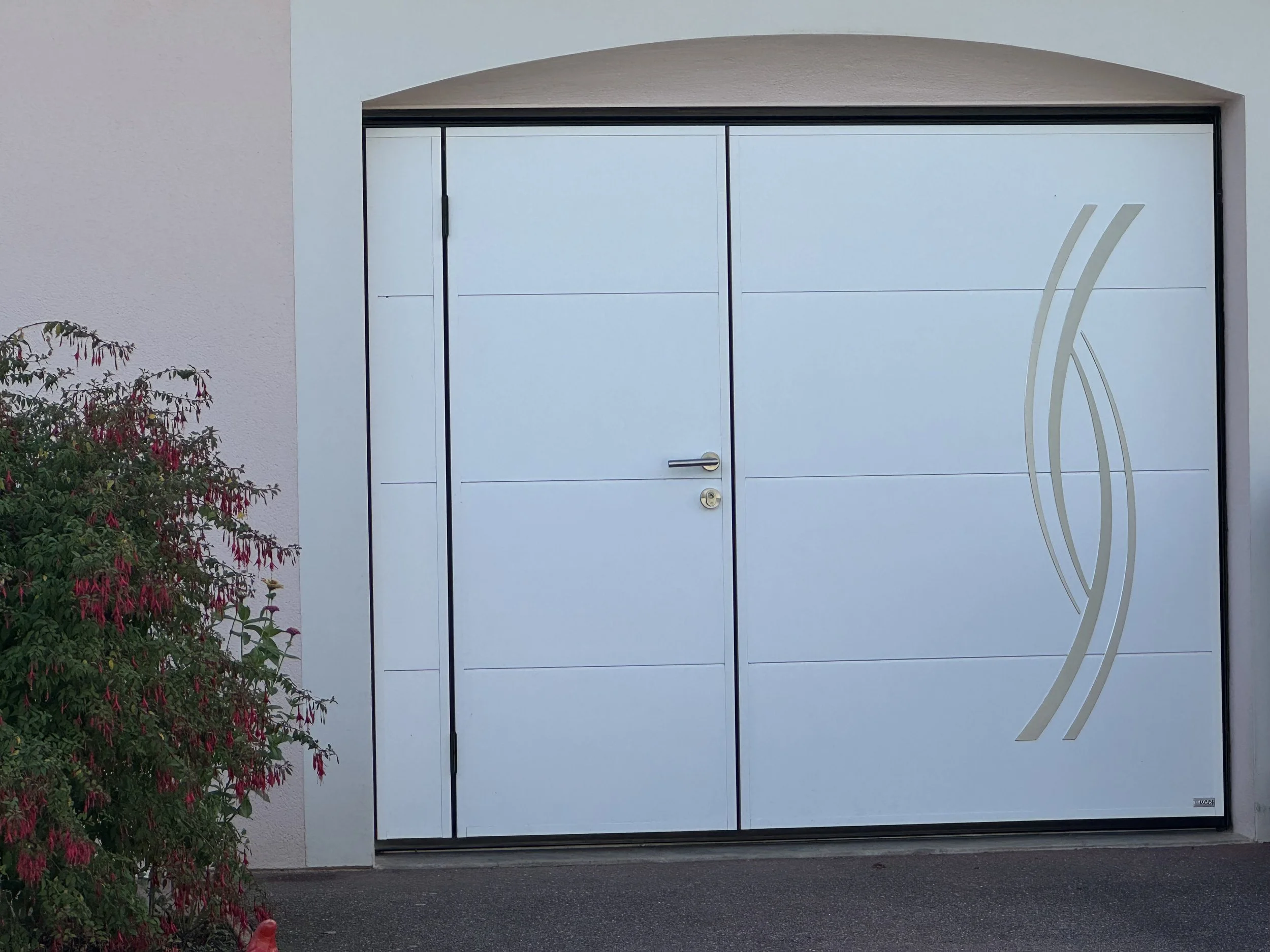 Porte de garage MOOS basculante avec portillon et insert inox Porte d’entrée PVC Pierret avec insert inox + Fixe vitrée avec récupération du vitrail existant